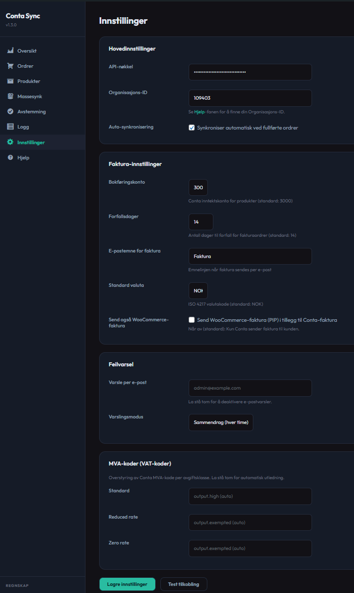/org/i URL-en når du er logget inn på conta.no) - Klikk «Test tilkobling» for å bekrefte at alt fungerer