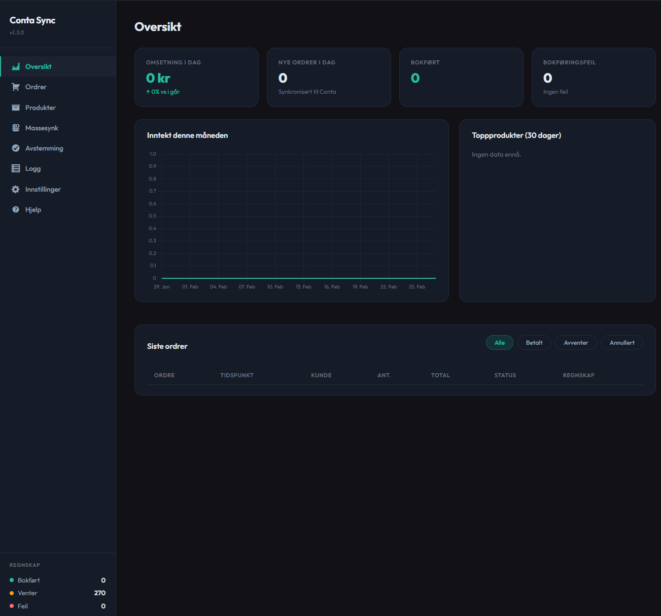 - Dashboard — Daglig omsetning, synkroniseringsstatus, 30-dagers inntektsgraf, toppprodukter og siste ordrer i én oversiktlig fane